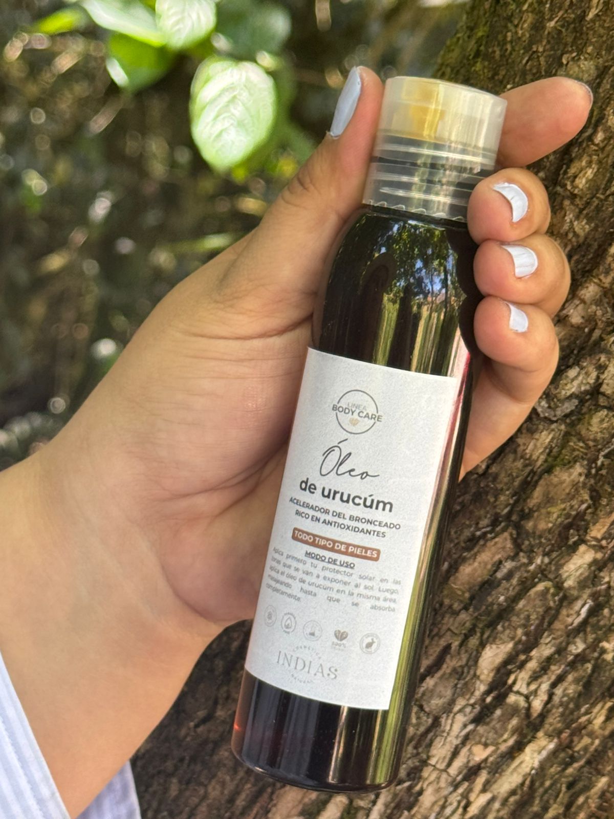 Aplica primero tu protector solar en las zonas que se van a exponer al sol. Luego, aplica el óleo de urucum en la misma área, masajeando hasta que se absorba completamente. Exponte al sol en horarios seguros (evitar las horas pico). Es importante retocar tanto el protector solar como el óleo después de entrar al agua.
